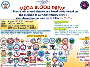 राजेन्द्र वाग्ले ः नेपाली समाज टेक्सास स्थापनाको २५ बर्ष पुगेको छ । उक्त अवसरमा अगष्ट महिनाको २६ तारेख शनिबारका दिन युलेश लाईव्रेरीमा बृहत रक्तदान कार्यक्रम हुँदैछ । ड्यालस फोर्ट वर्थ क्षेत्रमा प्राय जसो हरेक महिना रक्तदान कार्यक्रम आयोजना हुने गर्दछन तर यो कार्यक्रम नेपाली समुदायले गर्न लागेको अहिले सम्मकै बृहत रक्तदान कार्यक्रम हो । यो कार्यक्रमको नेपाली समाज टेक्सास, व्लड डोनर्स अफ अमेरिका, सिटी अफ युलेशले व्यवस्थापन गर्दै छन भने टेक्सासको ड्यालस फोर्टवर्थ क्षेत्रमा रहेका नेपाली समुदायका सम्पूर्ण सँघ सँस्थाहरुको सहभागिता, सहकार्य र सहयोग रहेको छ । टेक्सासमा रहेका नेपाली भाषामा सन्चालित मिडियाहरु पनि साझेदार छन । कार्यक्रममा सिटी अफ युलेशका पदाधिकारीहरु, अन्य अधिकारीहरु पनि सहभागि हुँदैछन । कार्यक्रमको लजिष्टिक खर्च पनि सिटी अफ युलेशले व्यवस्थापन गर्दैछ ।