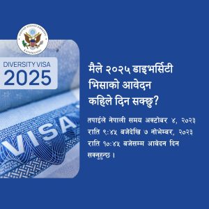 अमेरिकी इलेकट्रोनिक्स डाइभर्सिटी भिसा (डिभी) को आवेदन बुधबारबाट खुला भएको छ । नेपालस्थित अमेरिकी दूतावासले सन् २०२५ का लागि नेपाली समयअनुसार बुधबार राति ९ः४५ बजेबाट आबेदन खुलेको र कात्तिक २९ गते राति १०ः४५ बजे बन्द हुने जनाएको छ । डिभी भर्नको लागि अमेरिकी स्टेट गभर्मेन्टको साइटमा गएर आफ्नो सक्कली कागजात राखेर भर्न सकिन्छ ।