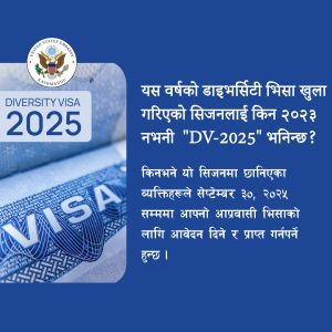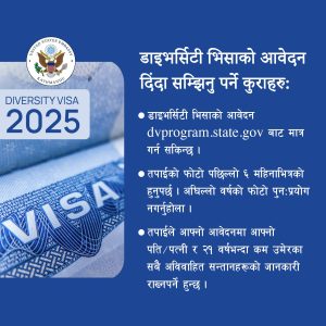 ३. फारम अनलाइन भर्नुपर्ने ः सन् २०२५ को डाइभर्सिटी भिसा कार्यक्रमका लागि आवेदकहरूले दर्ता अवधिमा  https://dvprogram.state.gov/   मा गई इलेक्ट्रोनिक डाइभर्सिटी भिसा (ई–डि.भी.) आवेदन फारम भर्नु पर्नेछ ।