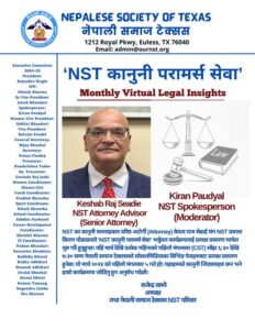 पछिल्लो समय अमेरिकामा रहेका नेपाली समुदायहरु बिभिन्न कानूनी सल्लाहको अभावमा पीडित बनिरहेका छन । एनएसटी कानूनी परामर्श सेवाबाट नेपाली समुदाय प्रत्यक्ष रुपमा लाभान्वित हुने नेपाली समाज टेक्सासले जनाएको छ ।